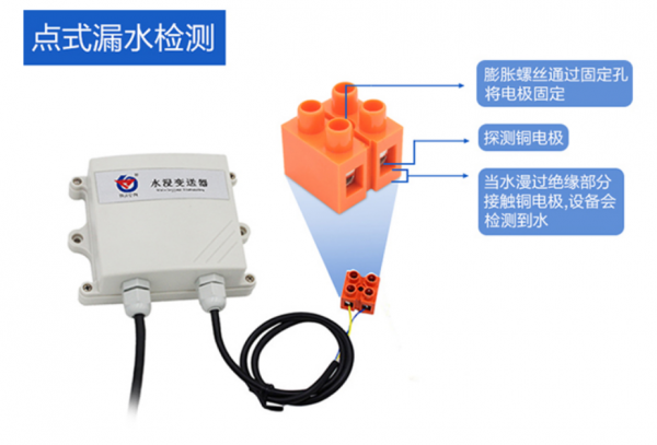 點式漏水監測:水浸傳感器通過膨脹螺絲固定孔將探測銅電極固定。當水浸過絕緣部分時,設備會接通,從而監測到水的存在。