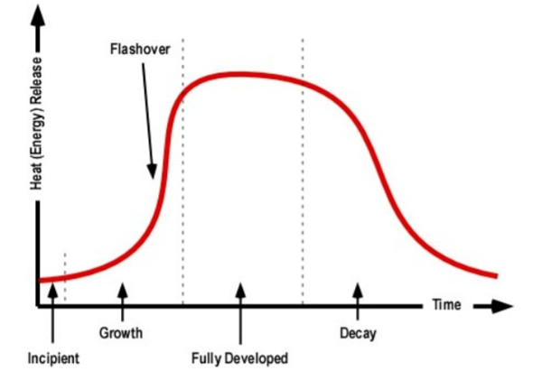 首先,我們先來了解一下火災發生線時間線,火災發展時間線是指在一個封閉的區域里,火災從起初階段(incipient), 火勢增長(Growth), 轟燃(Flashover), 充分燃燒(Fully Developed) 到衰減(Decay) 五個階段。縱坐標是熱釋放率,可以簡單的理解為火勢的大小。