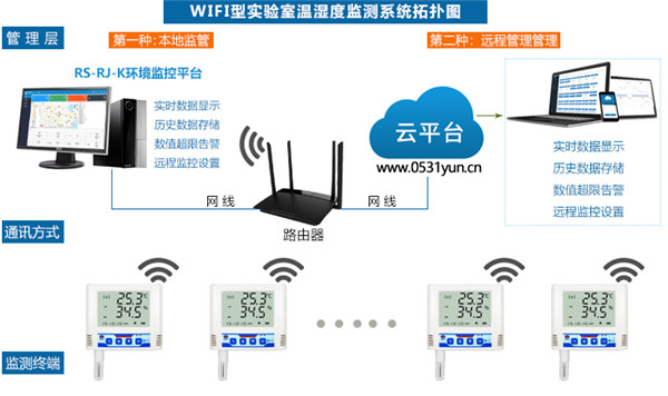 實驗室溫濕度監測系統由監測終端、通訊方式、應用層組成。WIFI型多探頭溫濕度記錄儀是系統的監測終端,采用一機多點的布置方式,也可以多機多點監測的布置方式,可實現24小時不間斷在線監控,數據異常后現場聲光報警,短信報警,APP報警,郵箱報警等功能。
