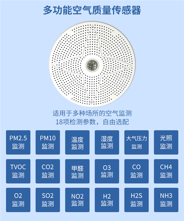 多功能空氣質量傳感器能同時監測十一種環境要素,可在溫度、濕度、PM2.5、PM10、大氣壓力、光照、TVOC、CO2、甲醛、O3等十種環境要素中至多選擇八種要素,并搭配CO、CH4、O2、SO2、NO2、H2、H2S、NH3中的三種氣體進行監測。
